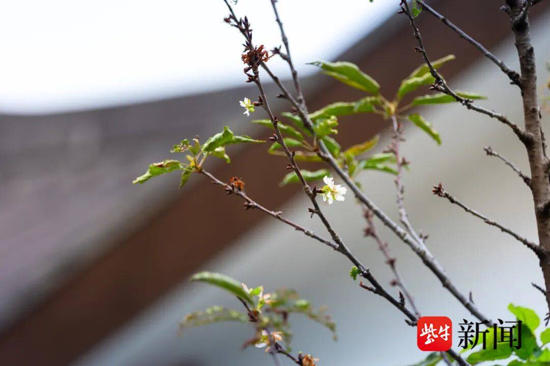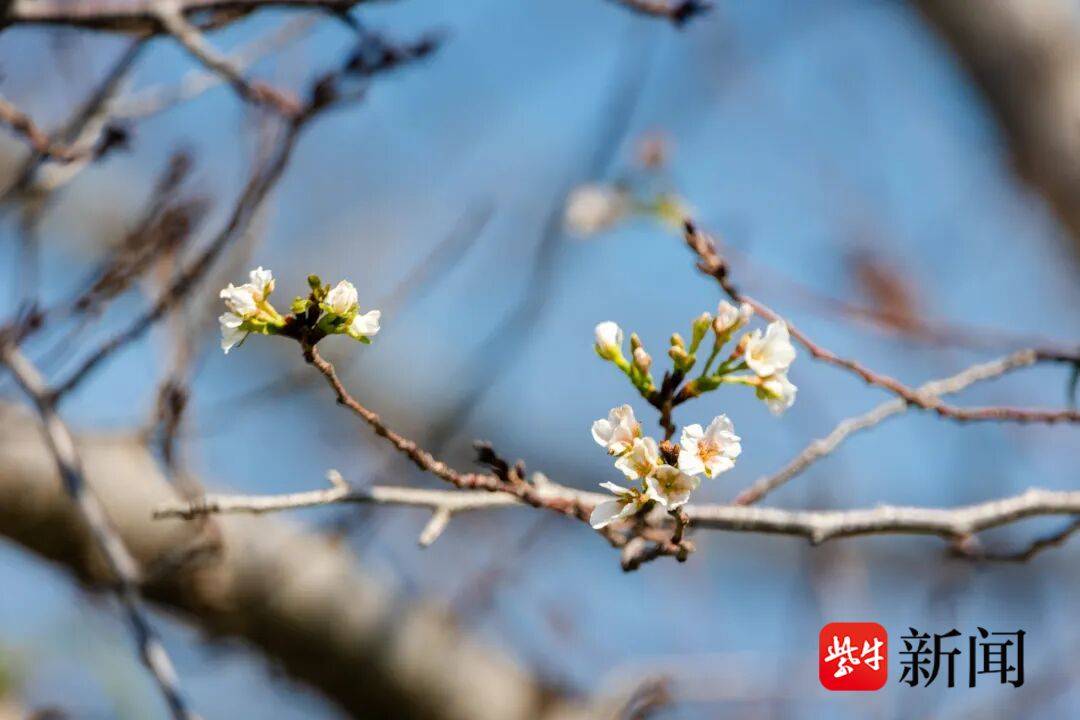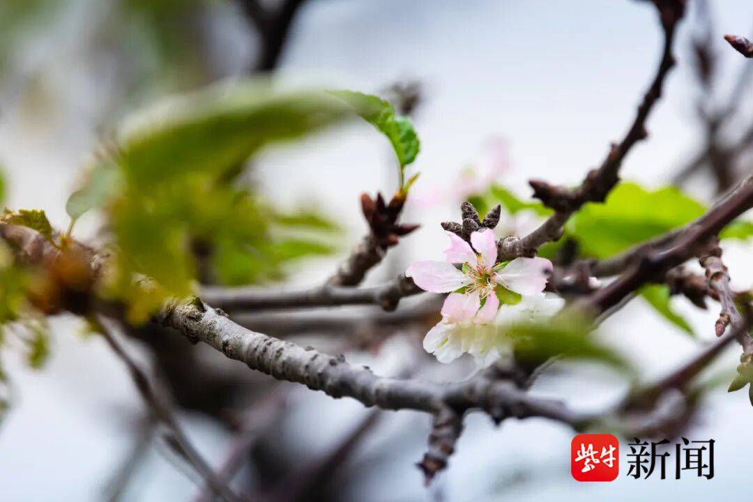 樱桃花本是南京早春的“先行者”,花期通常在每年3月中上旬。近期,受持续高温影响,在樱洲樱桃园入口区域,竟有一两株樱桃树枝头开出了娇巧玲珑的粉白色花朵。