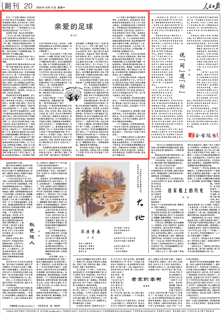 ○2025年,在过去的几个月里,我总是被问一个问题:你们的“苏超”怎么就这么火呢?我没能提供答案。其实,这个问题我也问过别人,我也没能得到答案。但是,有个事情我是知道的,江苏,尤其是南京,足球的土壤格外肥沃。好到什么地步呢?我就举例说明吧,有一个江苏作家,他生活在南京,他在南京写了许许多多的小说,可事实上,这是一个不务正业的家伙。他装模作样地做出一副知识分子的模样,却把大把大把的时间和大把大把的体能耗在了足球场上。每一场球他都很尽力,动不动就上气不接下气。和大口喘息的狗比较起来,他唯一的区别仅仅是不吐舌头。这个人就是我。