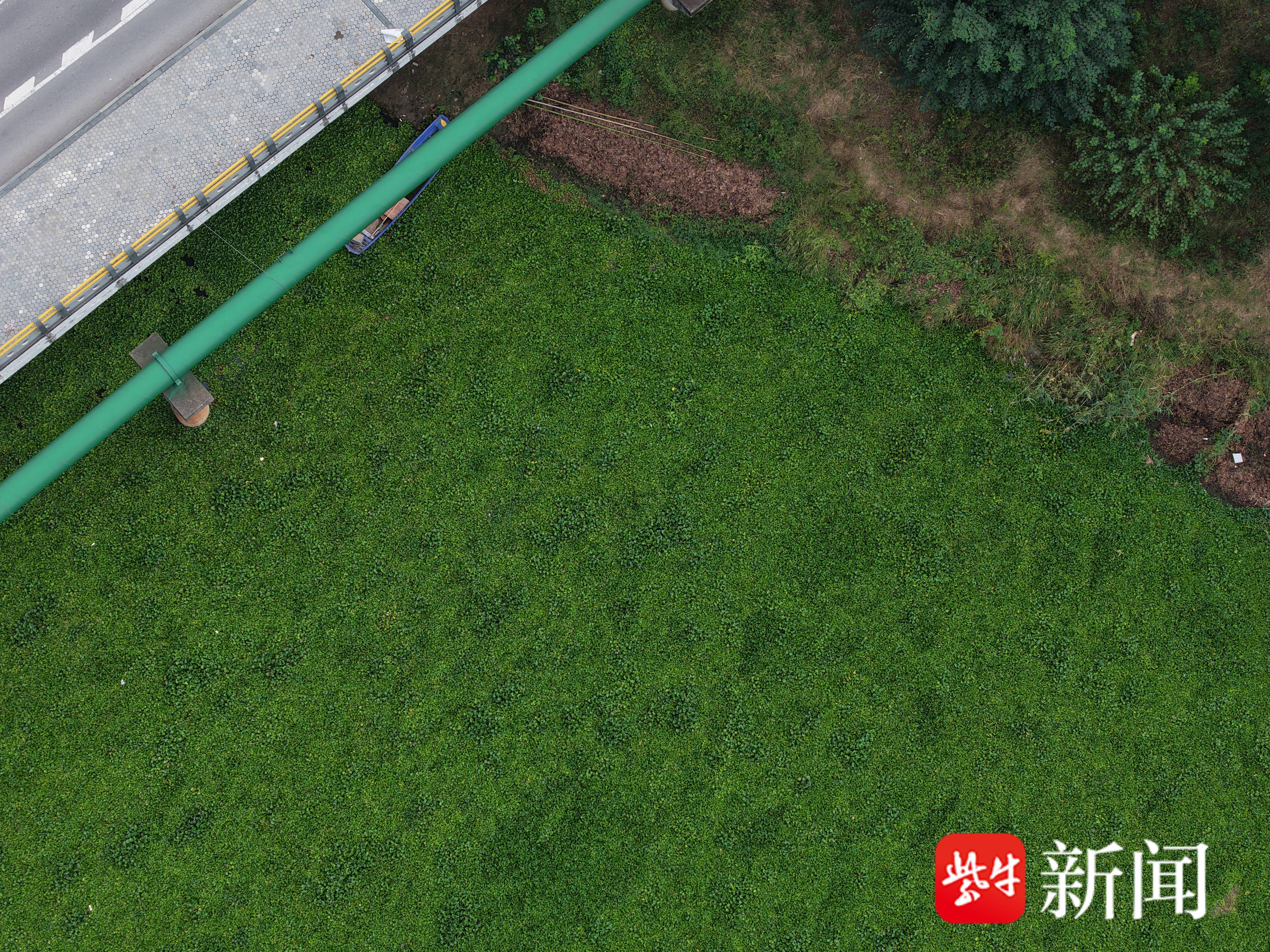 17日,南京夜生活论坛/紫牛新闻记者在苏源大道金村桥上看到了这处“大草坪”。从桥上看去几乎看不到河道里的水面,取而代之的是一片茂密的水草。如果不是因为桥下有个小船,下意识真的我会认为这里是一片草坪。