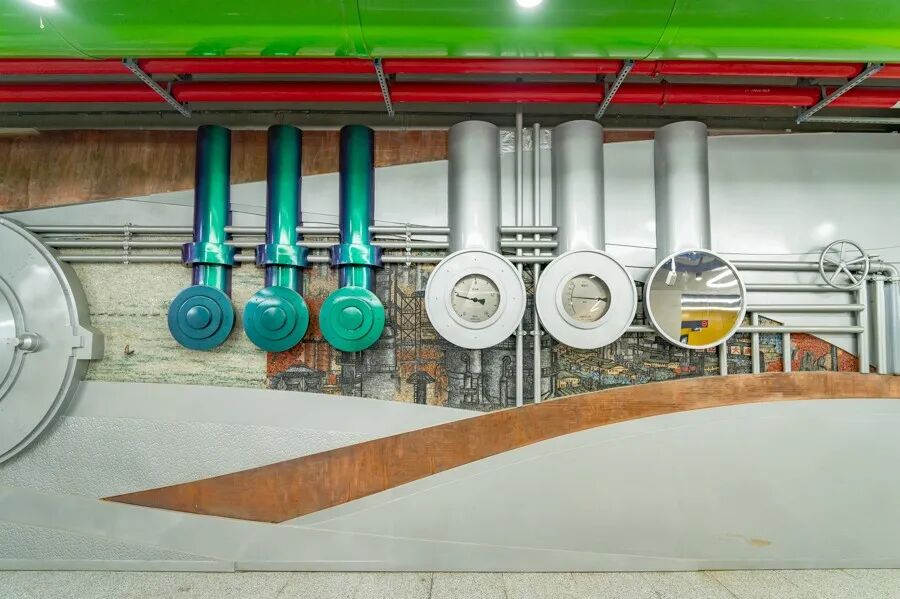 出入口的螺旋管道造型搭配幻彩不锈钢材质,赋予静态空间动态韵律;而艺术墙采用的马赛克壁画与立体装置,则静静讲述着金陵石化作为“南京老牌大厂”的绚烂历史。
