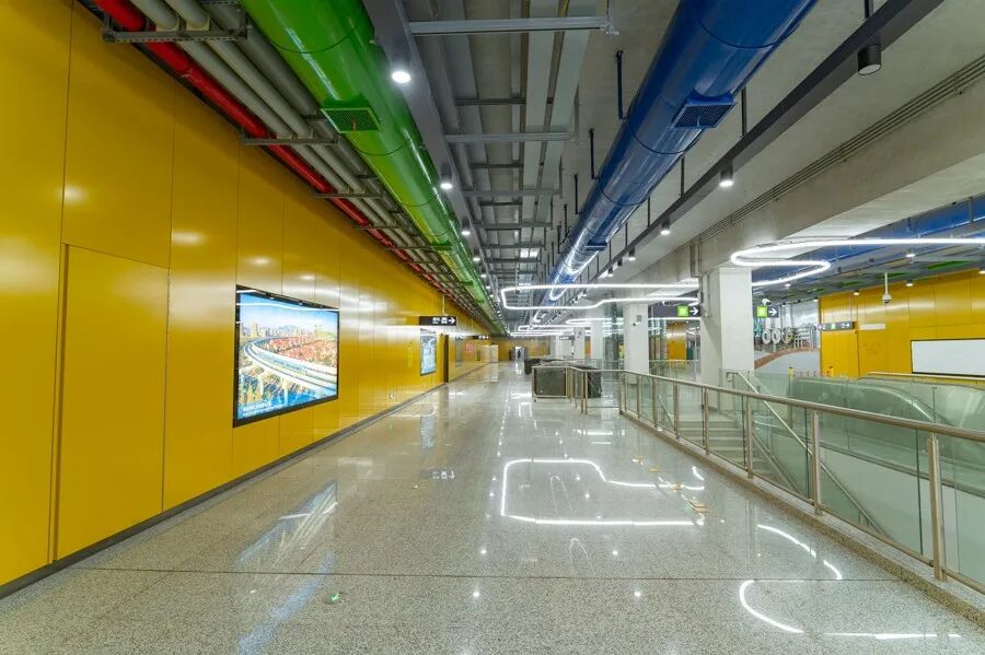 金陵石化站以南京首座工业风主题车站的姿态展露真容。这里没有传统地铁的封闭吊顶,蓝绿色圆形风管与红色消防管道在灰色清水混凝土顶面上整齐排布,与明黄色墙面形成强烈色彩碰撞,工业质感与科技感扑面而来。