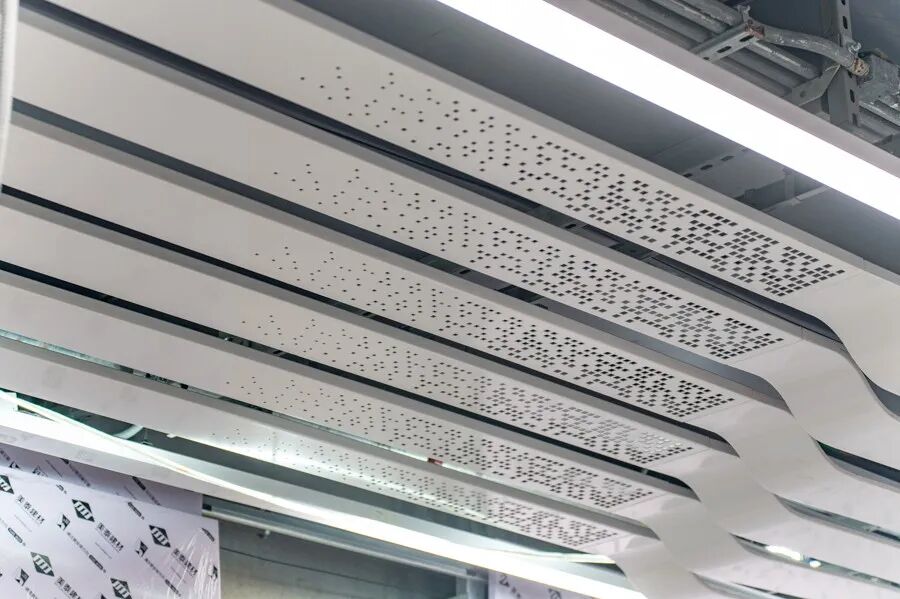 顶部两侧,装饰铝板斜向延伸,表面复刻的古籍装帧纹路细腻清晰,搭配嵌入式LED线条灯,恰似缓缓展开的鎏金书卷,诉说着栖霞山深厚的历史文化底蕴。