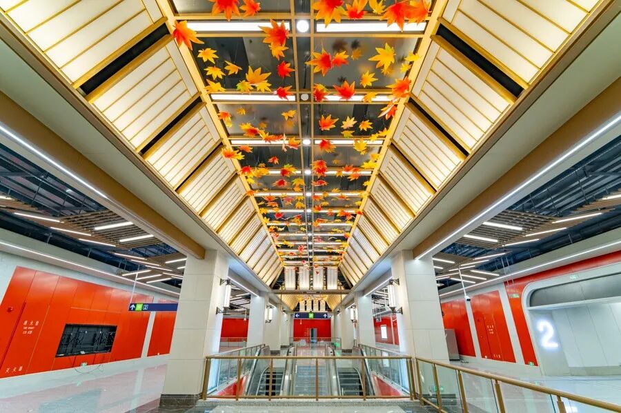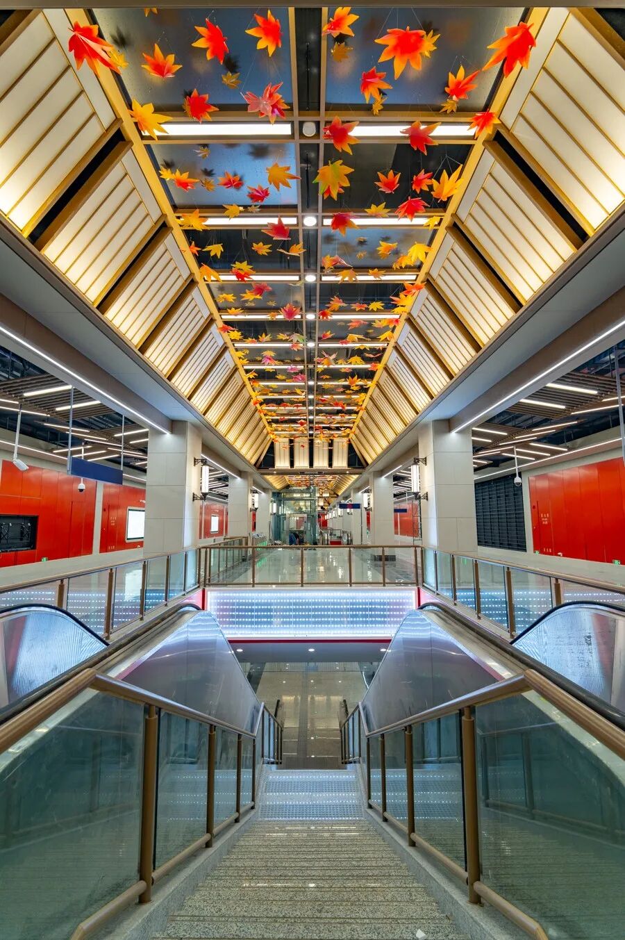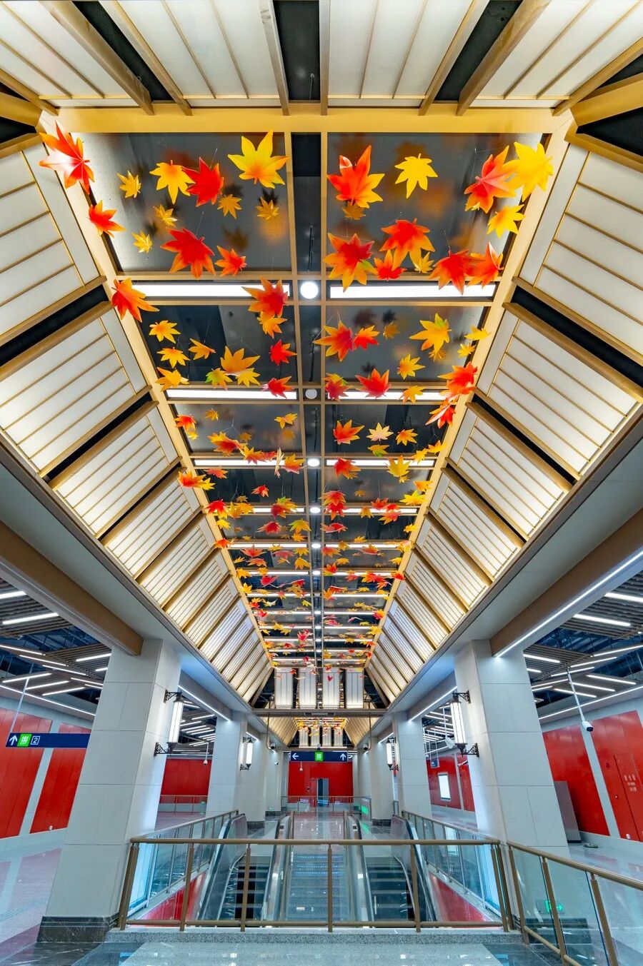 最让人惊艳的是车站屋顶下的枫叶艺术装置,数千片形态逼真的“枫叶”舒展悬垂。在灯光映照下,宛如深秋时节栖霞山漫山遍野的枫林被“搬”进了地下空间,让市民游客未出车站,便先“触摸”到栖霞山的秋意。
