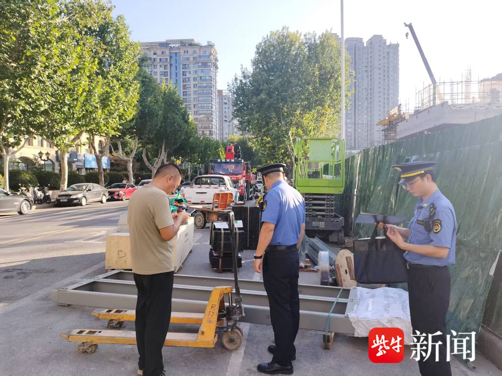面对这一情况,中队执法人员立即展开全面调查。经多方查证,得知涉事单位为该工地的总承包商,为追赶施工进度、图一时省事,便将大量建筑材料与设备违规堆放在公共道路上。执法队员当场对当事人进行严肃的批评教育,并详细阐释了《江苏省城市市容和环境卫生管理条例》相关规定:“任何单位和个人不得擅自在街道两侧和公共场地堆放物料”。执法人员指出,未经审批占用公共道路堆放物料属于违法行为,不仅破坏了城市环境的整洁有序,更直接导致了交通拥堵,也对行人安全构成威胁。在执法过程中,队员们始终坚持“普法与执法并重”的原则,耐心细致地释法释规,使当事人认识到自身行为的违法性与危害性。