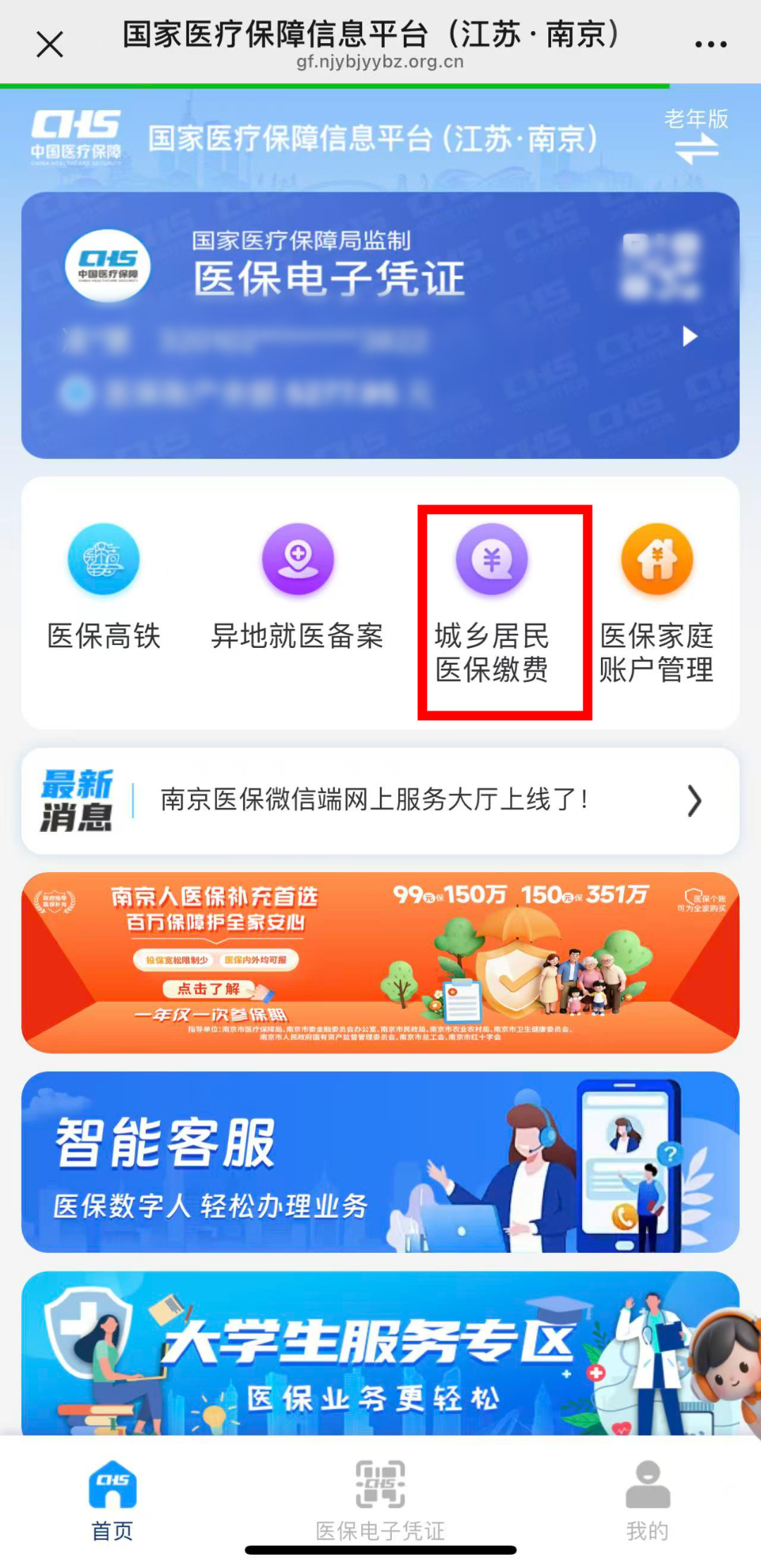 关注“南京医保”微信公众号,点击“服务大厅-城乡居民医保缴费”进入江苏税务社保缴纳小程序进行缴费。