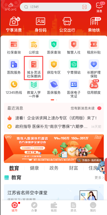 通过“我的南京”APP,“首页—城乡灵活社保缴纳”或“社区—城乡居民和灵活就业人员社保缴费”,点击社保缴费办理模块,进行缴费操作。