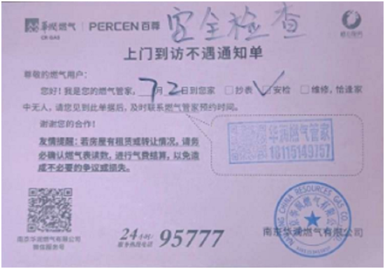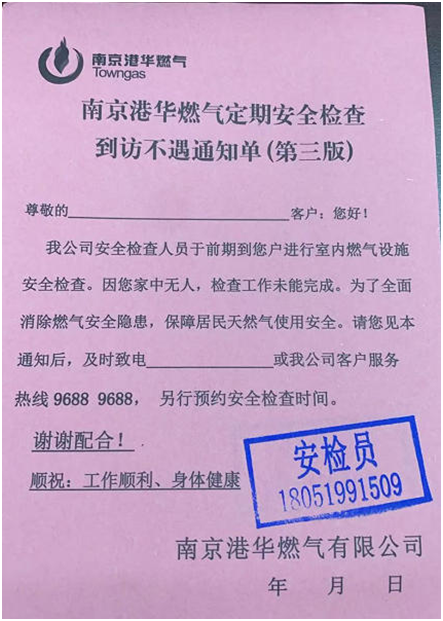 若因不在家、号码变更等原因导致燃气公司“到访不遇”,燃气公司就会在您家门口贴上一张《到访不遇通知单》。