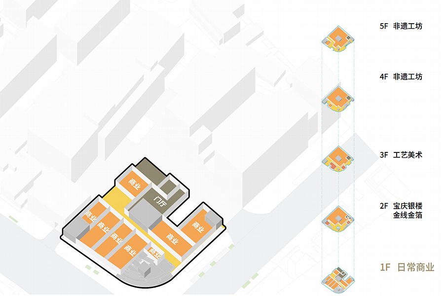 “我们从传统建筑设计形式中汲取灵感,”设计负责人介绍,“比如柱廊的秩序、游径的流动、框景的意境,重新诠释既有建筑的空间过渡与立体复合关系。通过穿插、叠加等手法,构建层次丰富的体验场所,积极营造建筑与城市街道之间的‘灰空间’,实现新旧共生、室内外交融的和谐场景。”