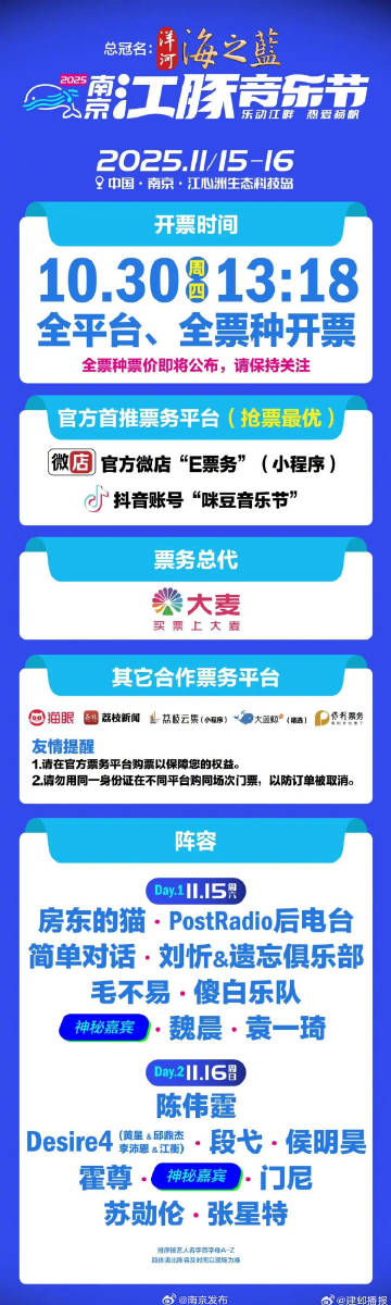 #江豚音乐节即将开票# 10月30日(周四)13:18,洋河海之蓝·2025南京江豚音乐节全平台全票种开票,准备好拼手速了吗?@建邺播报...
