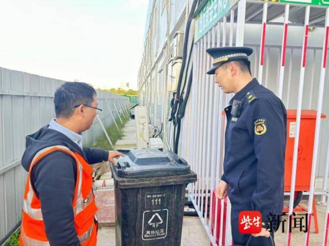 执法过程中,执法人员重点检查工地生活区垃圾分类设施配置及投放情况。经查,该工地存在生活垃圾混投现象,厨余垃圾桶内混入快递纸箱、塑料袋、餐盒等可回收物及其他垃圾。针对上述问题,执法人员依据《南京市生活垃圾管理条例》,现场向工地管理方开具《责令整改通知书》,明确要求限期整改相关问题,并引导工地管理方增设分类督导员、完善分类设施,确保建筑垃圾与生活垃圾“双线分离”。