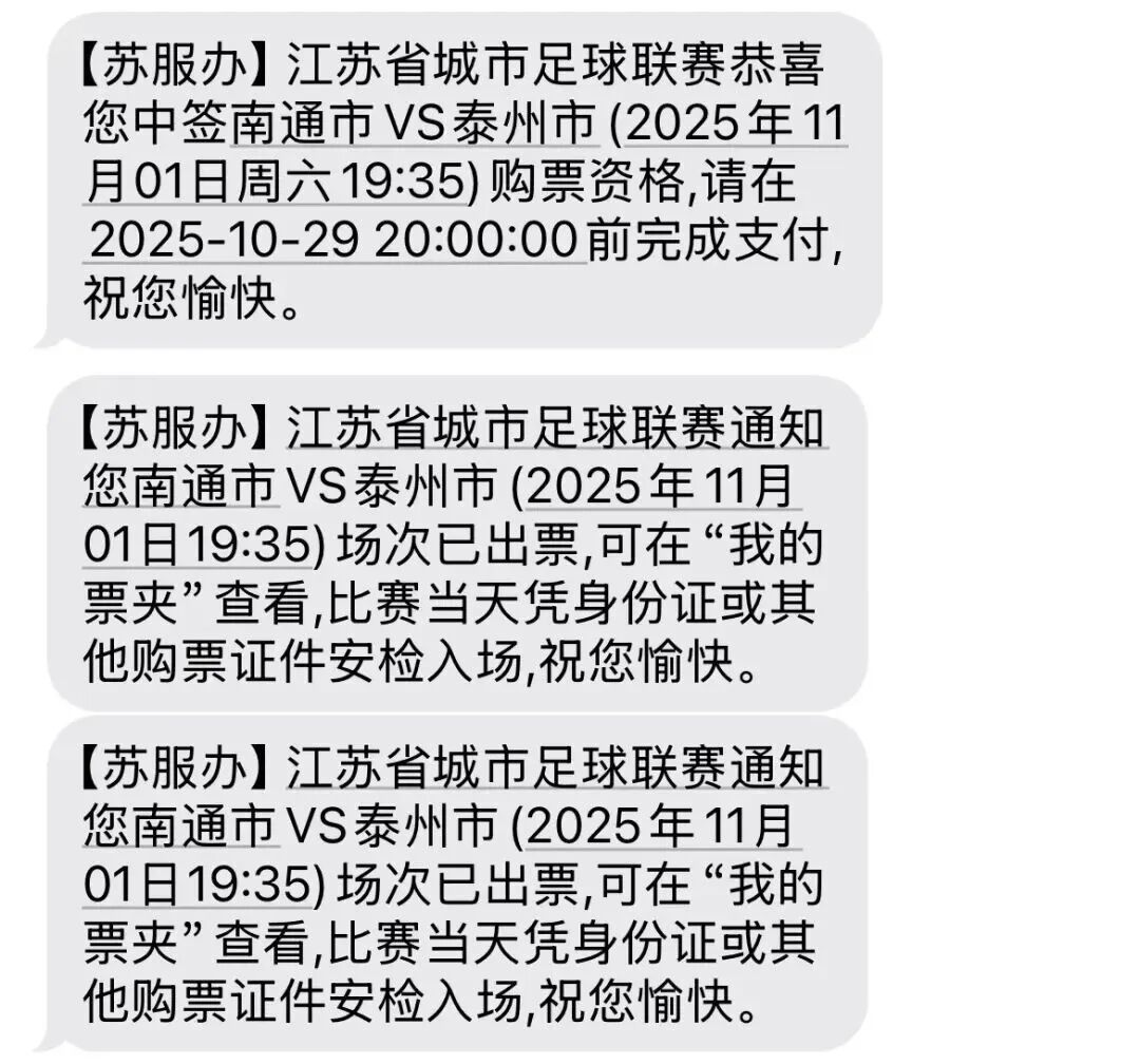 市民和球迷可于10月28日20时后在苏服办“省足球联赛预约购票”平台“我的预约”模块中查看抽签结果,中签的市民和球迷还将收到短信提醒。