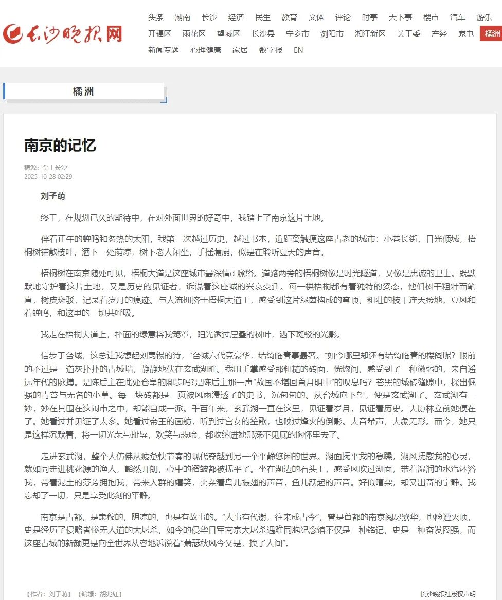 ○南京是古都,是肃穆的,阴凉的,也是有故事的。“人事有代谢,往来成古今”,曾是首都的南京阅尽繁华,也险遭灭顶,更是经历了侵略者惨无人道的大屠杀,如今的侵华日军南京大屠杀遇难同胞纪念馆不仅是一种铭记,更是一种奋发图强,而这座古城的新颜更是向全世界从容地诉说着“萧瑟秋风今又是,换了人间”。