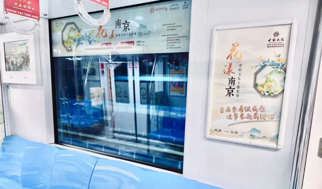 联展期间,“读城——湖熟×熙南里,重阳文化主题展览”专列惊喜上线,从窗户到车门,目光所及之处,皆被浓浓的重阳氛围包裹。车厢变身移动文化展厅,金陵画卷在车窗流动,让你的日常通勤,变成一场不期而遇的文化邂逅。