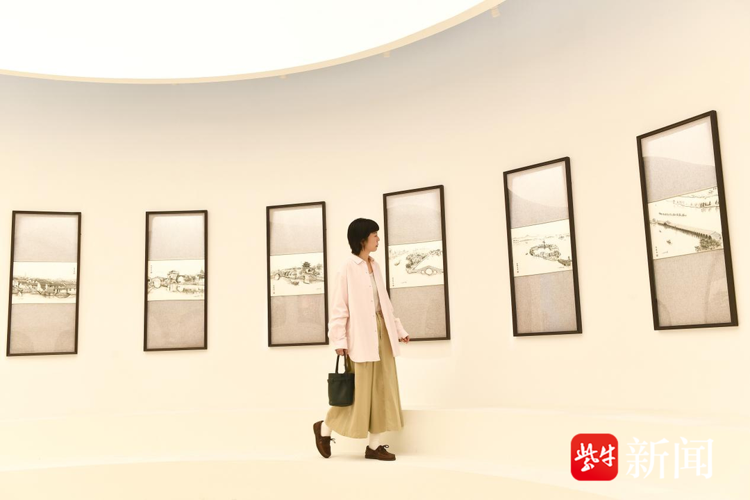移步到“亭台·视界”展区,空间内正中央悬浮着的巨大的环形发光艺术装置,仿佛一轮皎洁的满月。站在这轮“满月”之下,一侧是姚涛创作的《运河十景》,一侧则是用“米粉”用小米手机记录下的美好瞬间,科技与美学的深层共鸣在此展开。