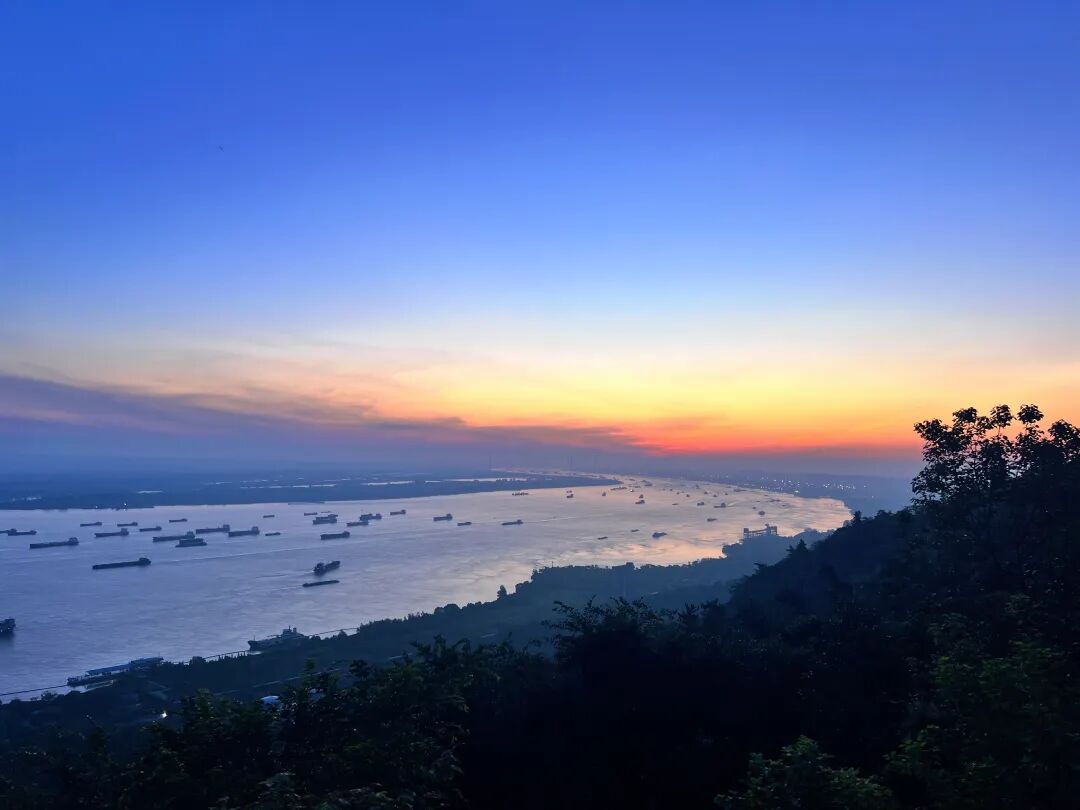 ○终于登顶,眼前豁然开朗。大家都有些气喘吁吁,我身上出了一层细汗。山顶上,有一座建在临江观景台上的方形亭子,亭上写着“剑决浮云”四个大字,亭外树木葱茏。走入亭中凭栏远眺,只见天已大亮,长江在山下蜿蜒奔流。滚滚东去的江面上,成百上千只船舶像模型般精巧。到了长江拐弯处,船舶仿佛也都倾斜了身子,想要轻捷地滑过江面。头顶的天空一片灰白,只有东边水天相接处有橙色的一线。