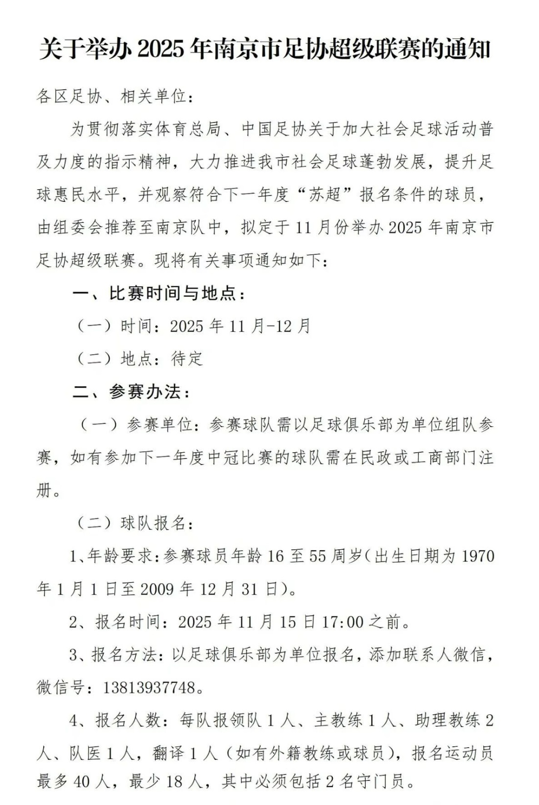 2025年11月,南京市足协将举办新一届城市超级联赛,这项传统赛事也将兼顾为中冠球队选拔以及为苏超联赛南京队筛选球员的双项功能。南京夜生活论坛/紫牛新闻记者 张昊