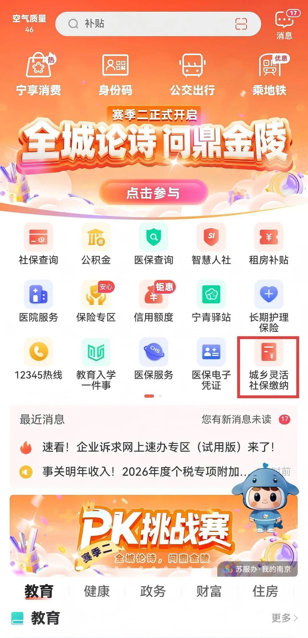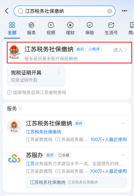 微信缴费方式:关注“南京税务”公众号,依次点击“微服务”—“社保缴纳”或者微信搜索“江苏税务社保缴纳”小程序办理。