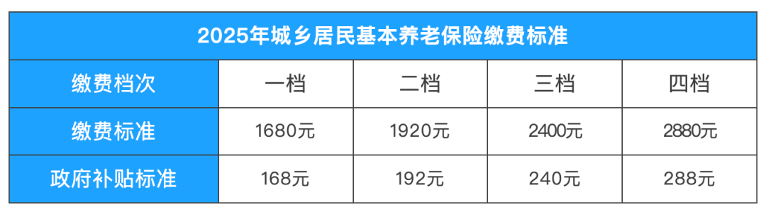 2025年度城乡居民基本养老保险缴费标准分为四个档次,并实行“多缴多补”的差别化补贴标准,您选择的缴费档次越高,享受的政府补贴也越多,个人缴费与政府补贴将全额计入您的个人账户,直接决定未来每月养老待遇水平。
