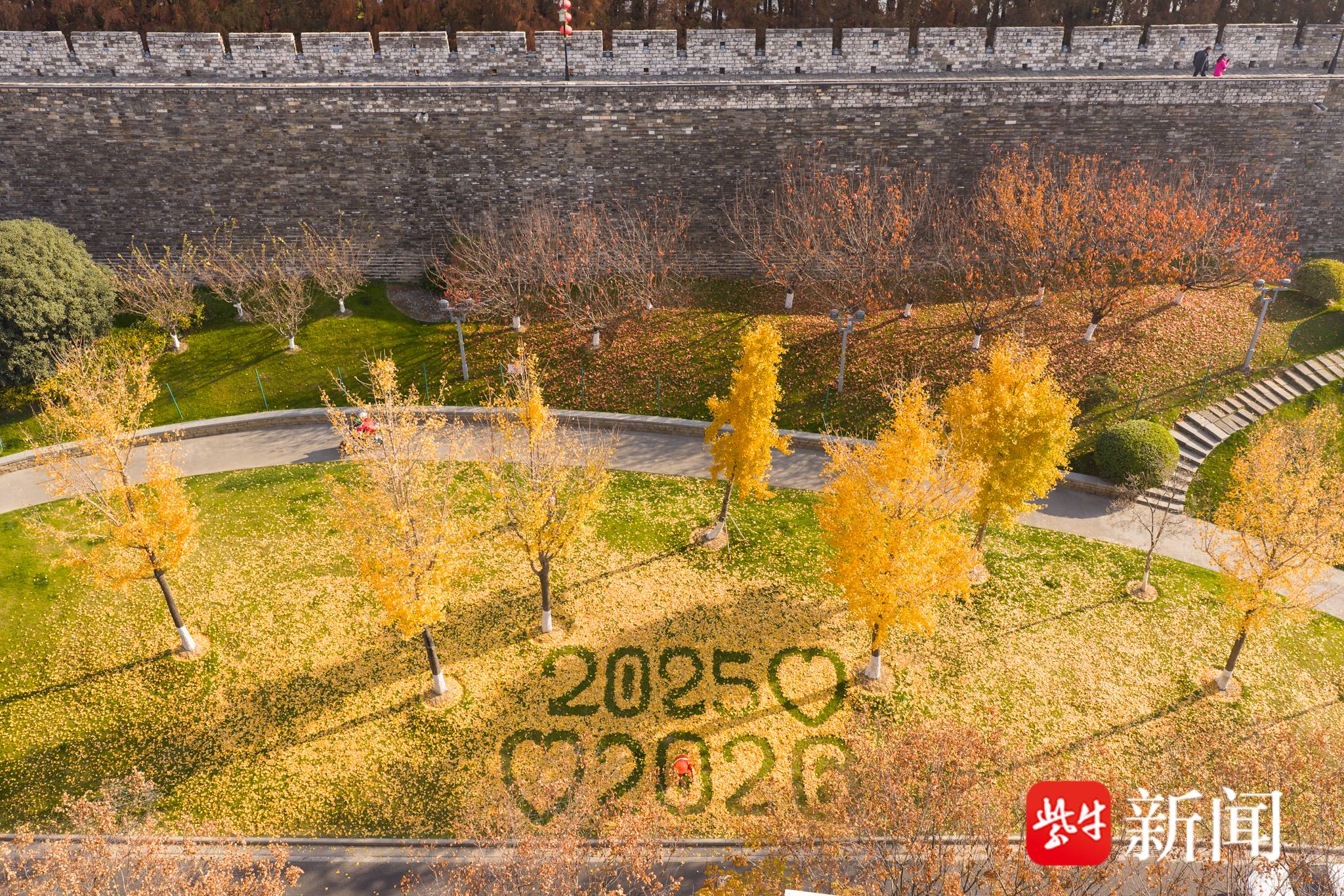 南京城墙下的银杏叶被拼成“2025爱2026” 摄影:吴咏进