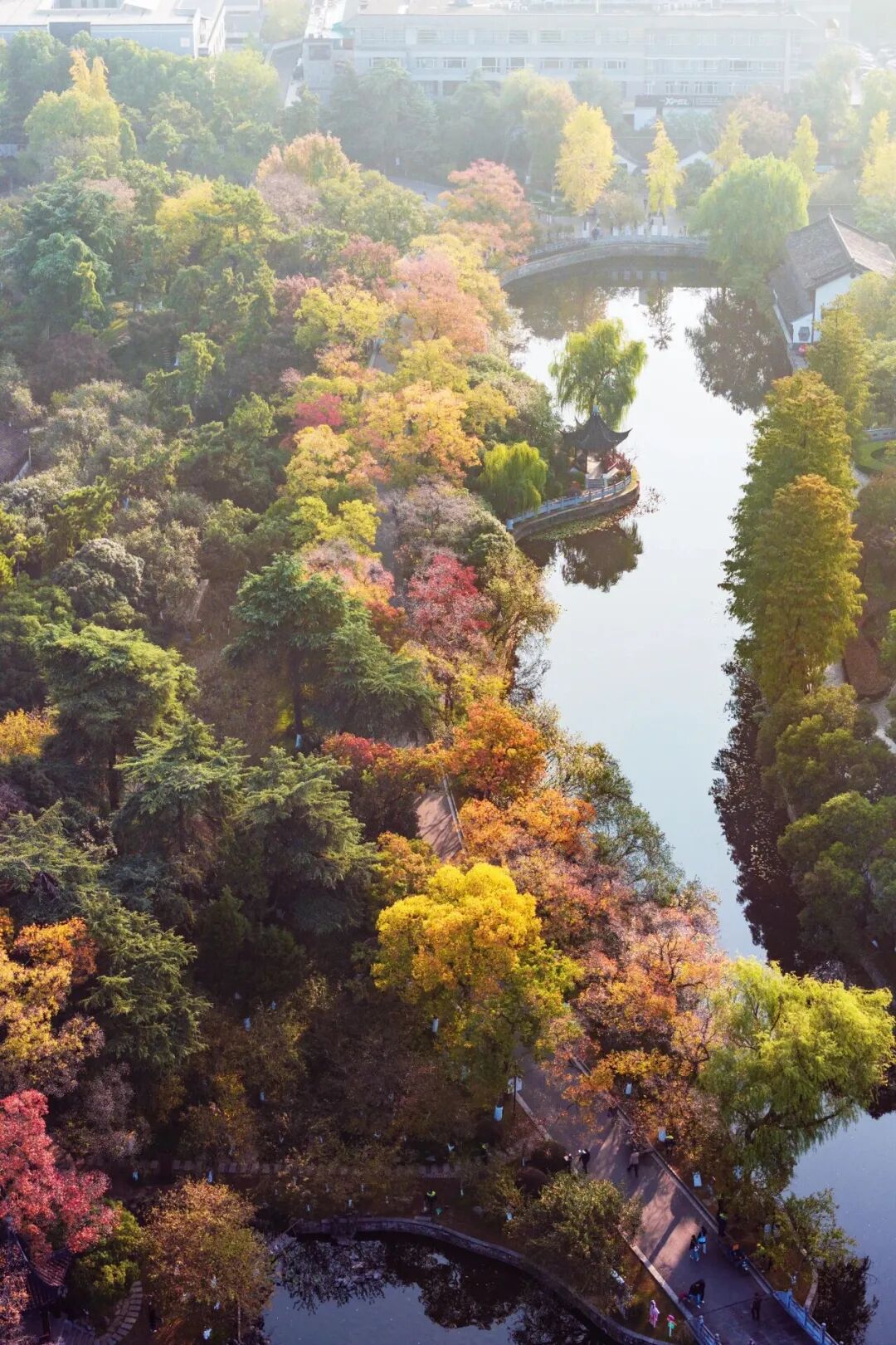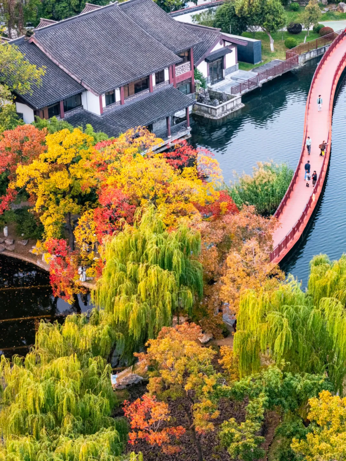 银杏、乌桕与湖水、亭台楼阁相映成趣,是想象中的江南园林没错了。