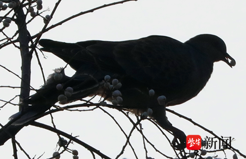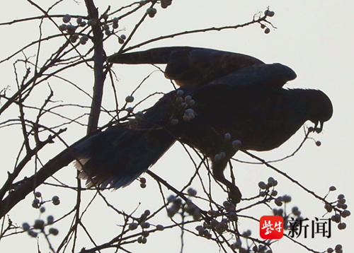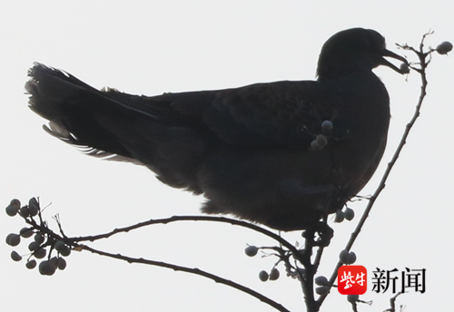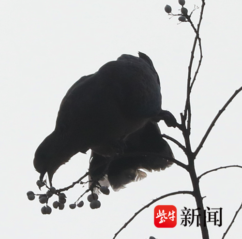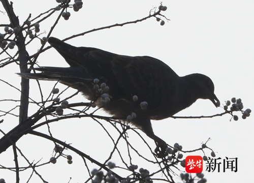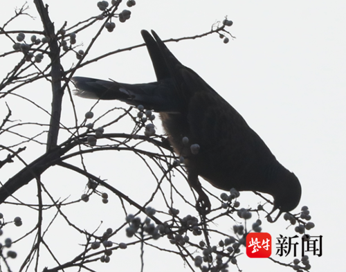 现场发现,十多只斑鸠在高大的乌桕树上“就餐”。乌桕果子对于斑鸠来说毫不费力,只要选中了一颗,用力一揪,乌桕果实就到了嘴里。斑鸠甚至还在树枝上,玩起高难度倒挂金钩绝活。这几棵树上热闹非凡,各种鸟儿争相啄食,仿佛在进行一场大自然的盛宴。