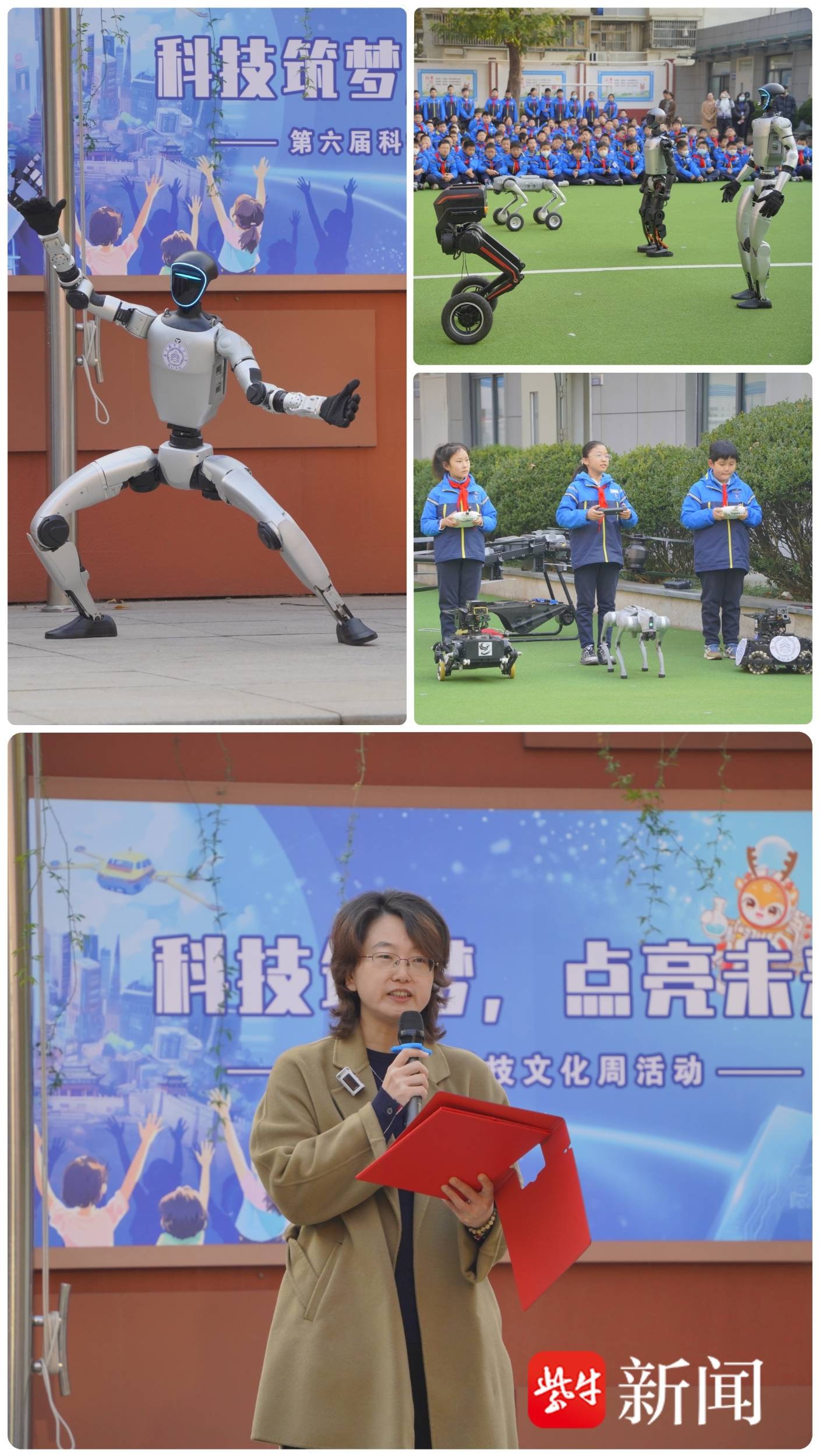 开幕式亮点纷呈,机器人天团惊艳亮相。机器狗卖萌互动,轮足机器人展现绝技,人形机器人随乐起舞,无人机空中穿梭,精彩表演赢得全场欢呼。随后,玄武区教育局特聘的科学副校长焦雪副主任带来寄语,点燃了玄小鹿们的科创热情。