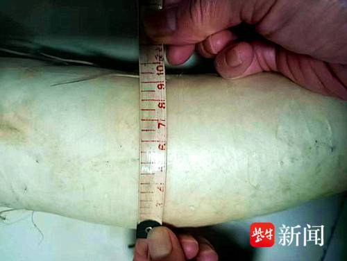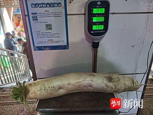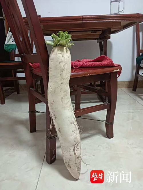 南京夜生活论坛网1月3日讯(通讯员 徐福庚 记者 闫春旭)白萝卜谁都见过,近6斤重的白萝卜你见过吗?南京一位市民早晨打开从老家盐城东台带回来的蔬菜,惊奇发现塑料袋里的一棵白萝卜特别大。随后将白萝卜拿到后宰门农贸市场复秤处电子秤一放,显示屏上跳出2.975公斤。这个“巨无霸”萝卜形似小腿, 经测量长57厘米、直径10厘米左右,立起来竟比椅子还要高 。