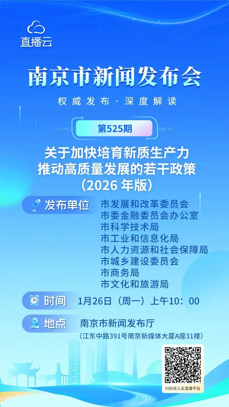 今天上午,南京市新闻发布会召开,发布并解读《关于加快培育新质生产力推动高质量发展的若干政策(2026年版)》并答记者问。
